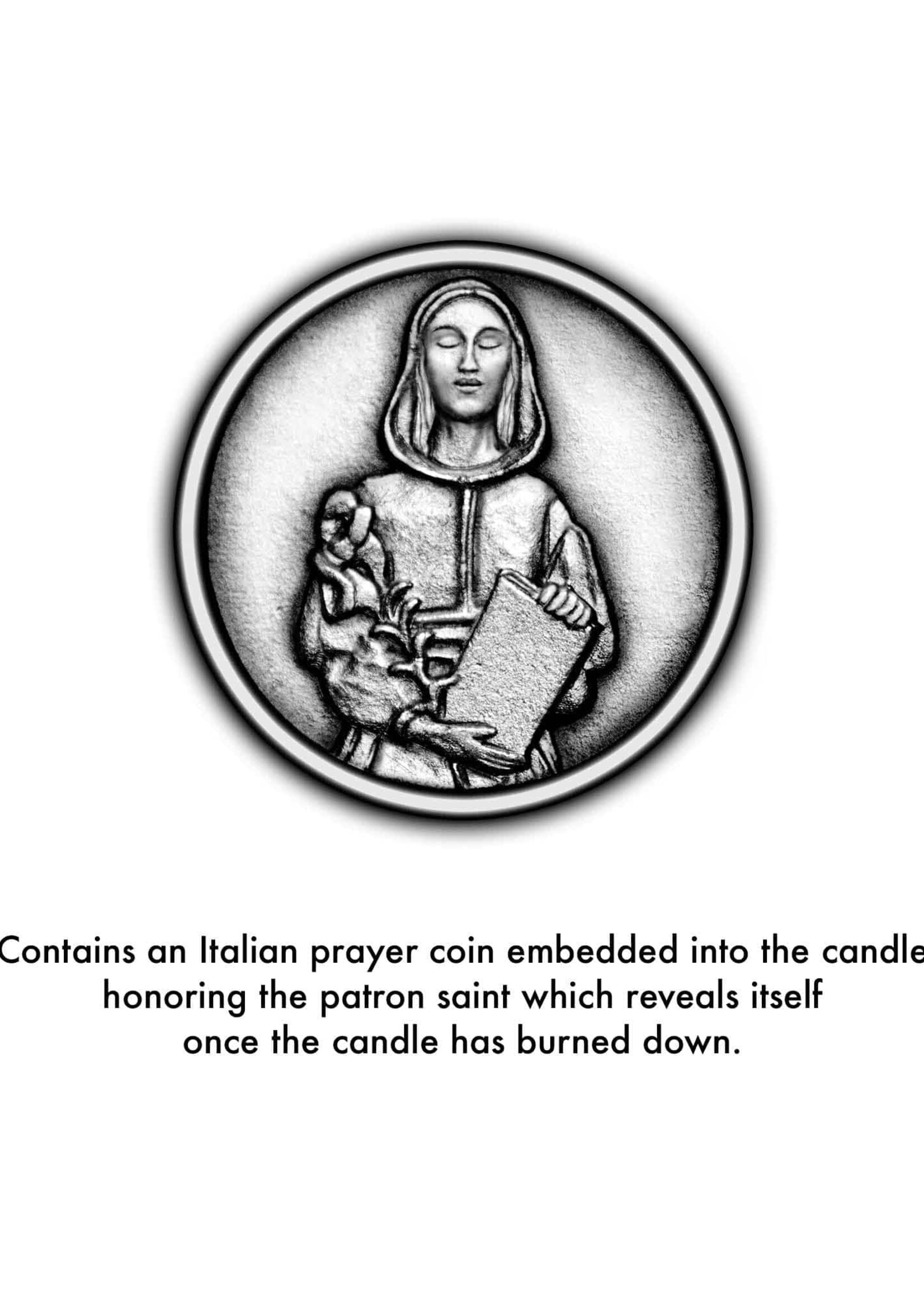 Each candle comes with a prayer to the patron saint and a prayer coin embedded in the wax. Before your first lighting, read the prayer to the patron saint, then light the candle. After the wax has burned all the way down, gently remove the coin and keep it in a place that’s meaningful to you—such as your wallet, purse, or car—as a constant reminder of faith and spiritual guidance.